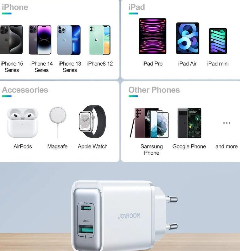Product Model: JR-TCF15Product Name: 30W Dual-Port (A+C) ChargerProduct Plug: EUProduct Color: WhiteProduct Input: 100-240V~,50/60Hz, 0.8AProduct Function: ChargingTotal Output: 30W(Max)Product Material: PC fireproof materialColor: White