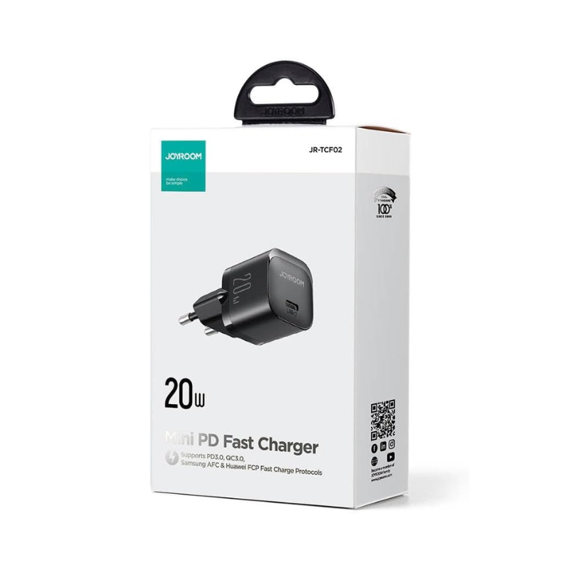 Model: JR-TCF02 (EU)Name: PD 20W mini ChargerMaterial: fireproof PCInput: AC 100-240V~50/60Hz, 0.6A (Max)USB-C output: 5V = 3A, 9V = 2,22A, 12V = 1.67ATotal output: 20W (Max)Size: 67.2*35.5*30.3mmConnector type: Type-CColor: Black