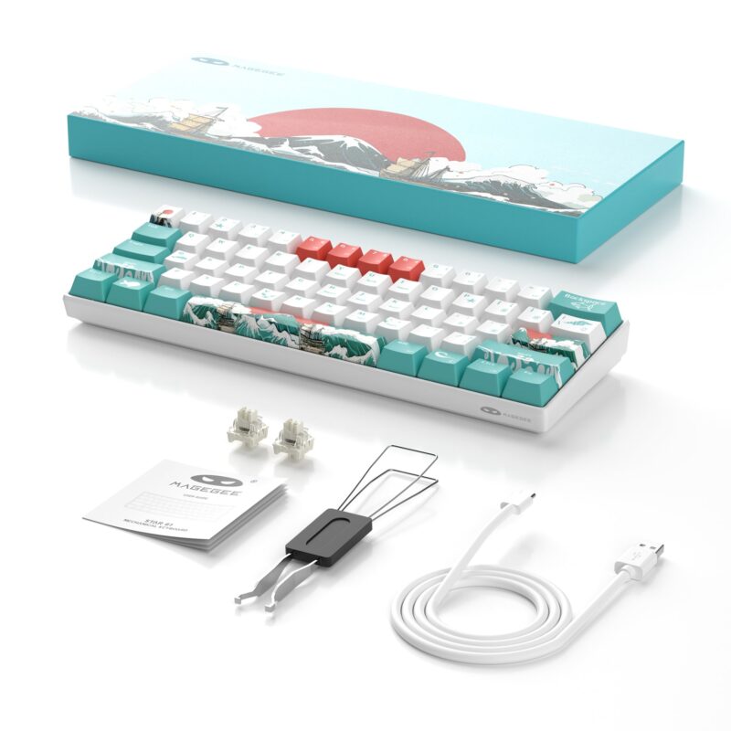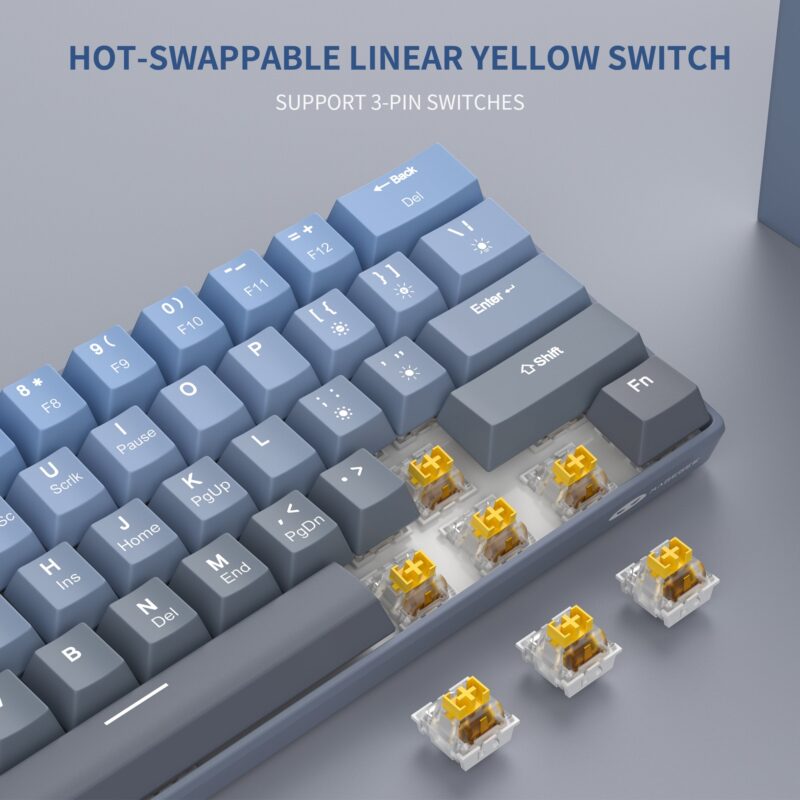 Description : Number of keys: 61 Lighting:Single color Weight:515g±10% Size:290*100*38mm Connecting: wired Interface: USB Cable Length: approx.1.5m 1. 60% Mechanical Keyboard with 61 keys 2. Ergonomic design with Cherry profile 3. PBT Dye-Sub keycaps with gradient blue color 4. Support all keys hot swap (3-pin plate- mounted) and N-key rollover 5. Detachable USB A-C connecting…