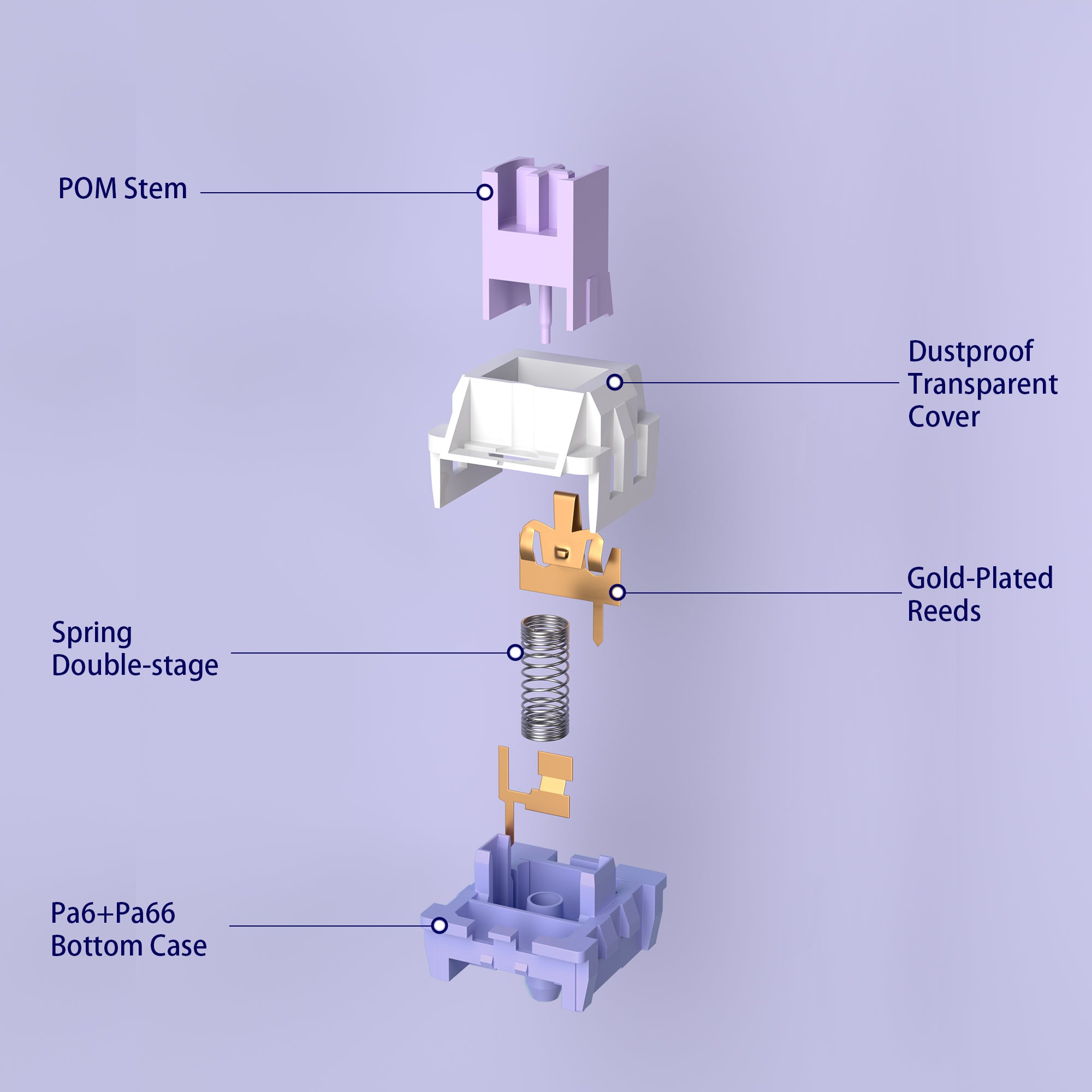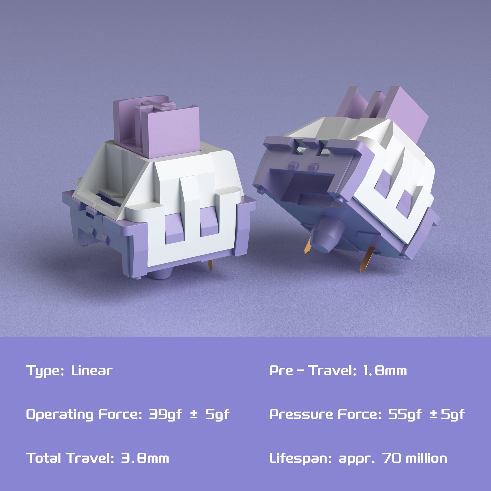 Switch Type: Linear Operating Force: 42gf±5gf Pressure Force: 55gf±5gf Pre Travel: 1.8mm Total Travel: 3.8mm Lifecycle: About 70 million keystrokes Pre-lubricated: Bottom and Shaft Stem:: POM Bottom:: Pa6+Pa66 Compatibility: Work with PCB mounted