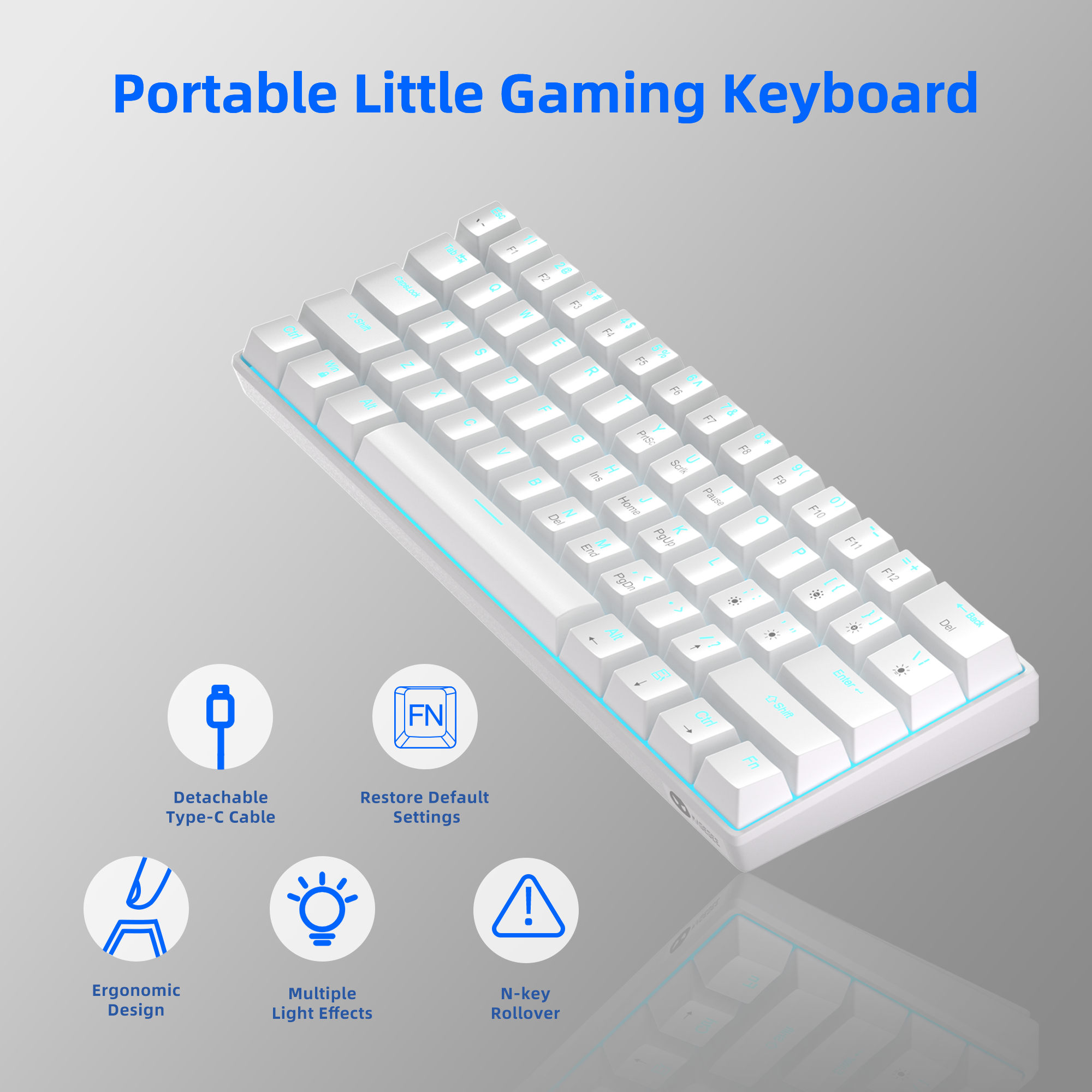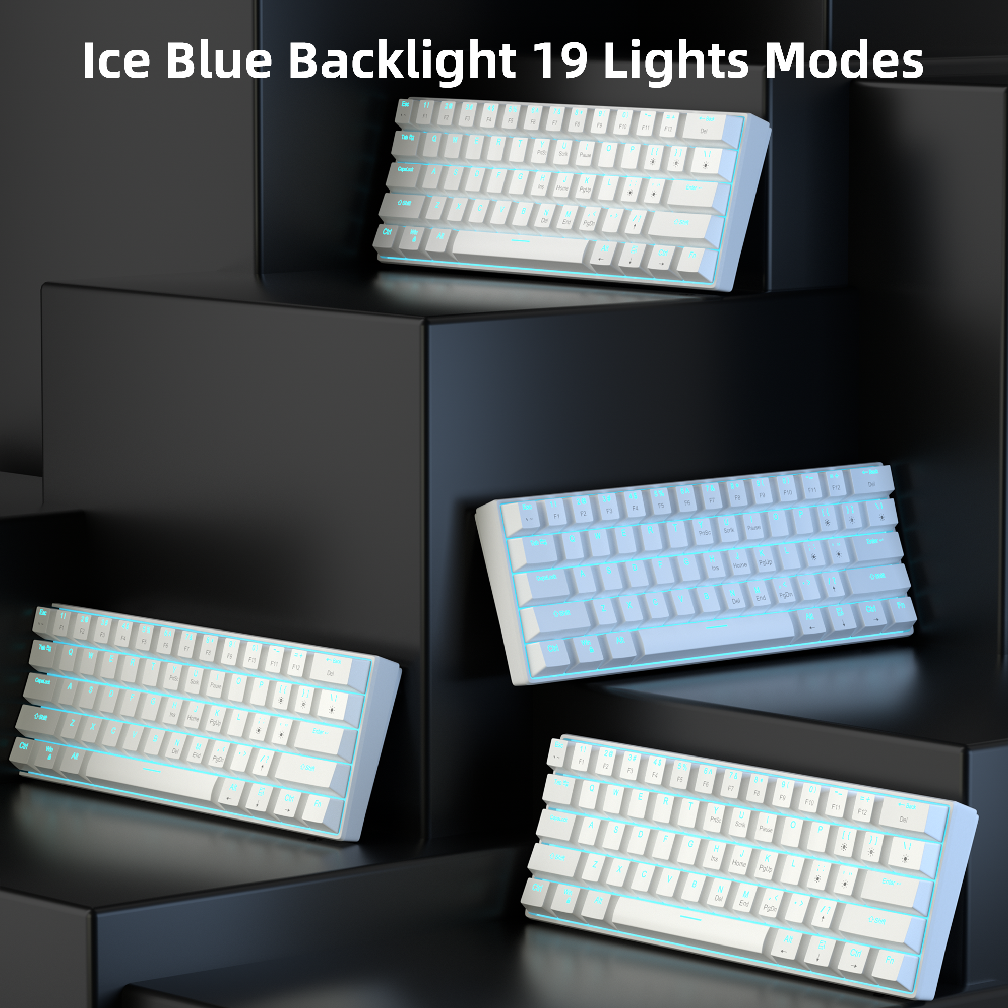 1. 60% Mechanical Keyboard with 61keys 2. Ergonomic design with OEM profile 3. ABS double-shot keycaps 4. Support all keys hot swap (3-pin plate-mounted) and N-key rollover 5. Detachable USB A-C connecting cable 6. Signle color lighting with different lighting modesand brightness 7. Support FN combination function keys