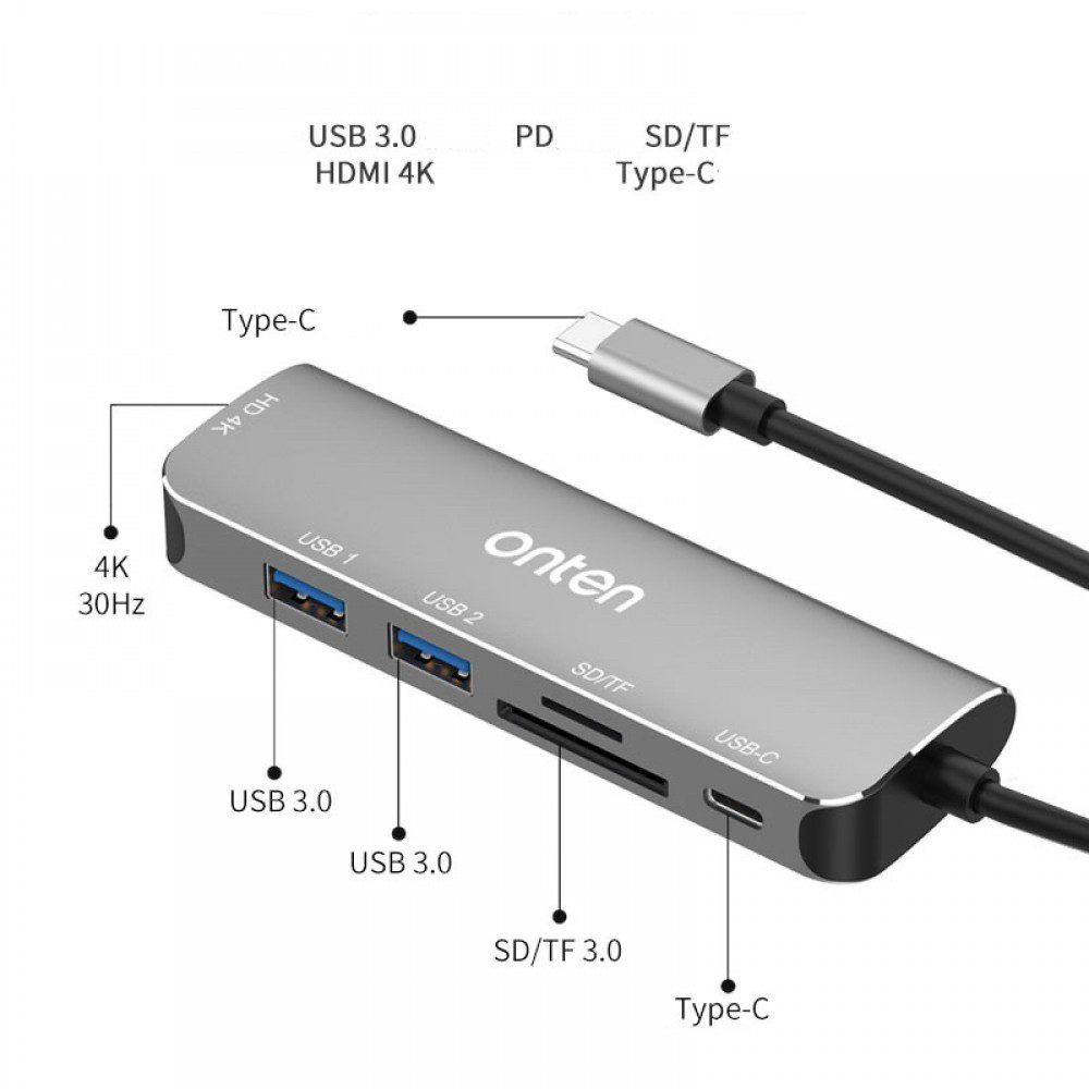 ONTEN 95116D USB C HUB Dock Station 6 in 1 – HDMI 4K@30Hz + SD/TF + USB 3.0 X2 + Type-C (PD 3.0)