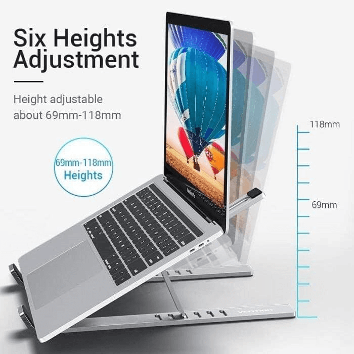 The stand laptop metal is compatible and versatile, with a universal size and a flexible application. The universal size is suitable and adaptable, and can fit most laptop models and sizes, from 10 to 17 inches. The flexible application is practical and useful, and can work with various surfaces and environments, such as desks, tables, sofas, beds, or floors. You can use this accessory to enhance your laptop’s appearance and functionality, and enjoy a smooth and comfortable experience.
