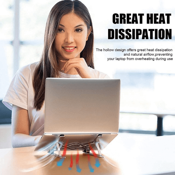 The stand laptop metal has a ventilation and cooling system, with a hollow design and a heat dissipation function. The hollow design is breathable and airy, and allows the air to circulate freely around your laptop. The heat dissipation function is efficient and effective, and transfers the heat from your laptop to the metal surface. You can use this accessory to prevent your laptop from overheating and slowing down, and extend its lifespan and performance.